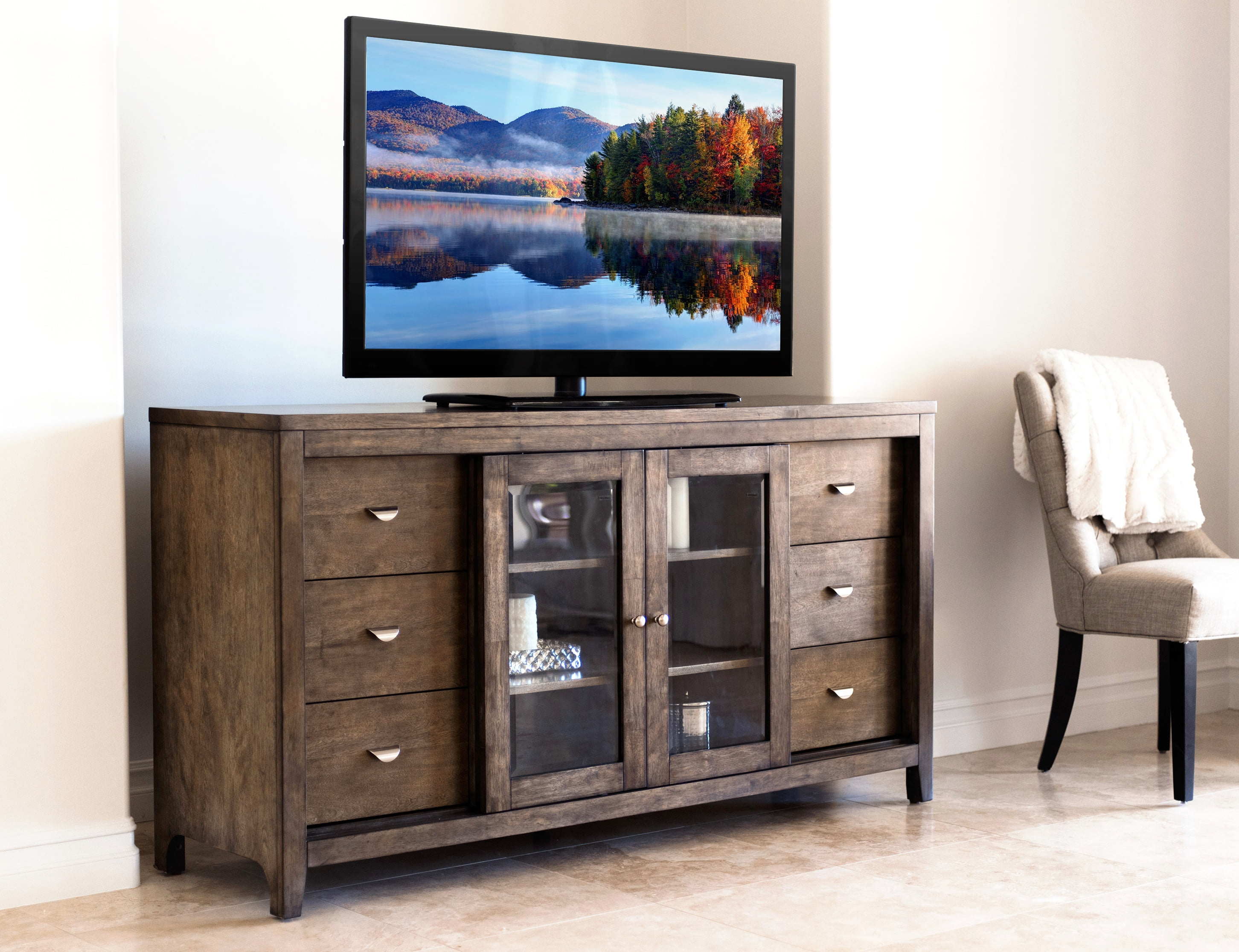 Stick to the basics with a wood media console in a natural space.