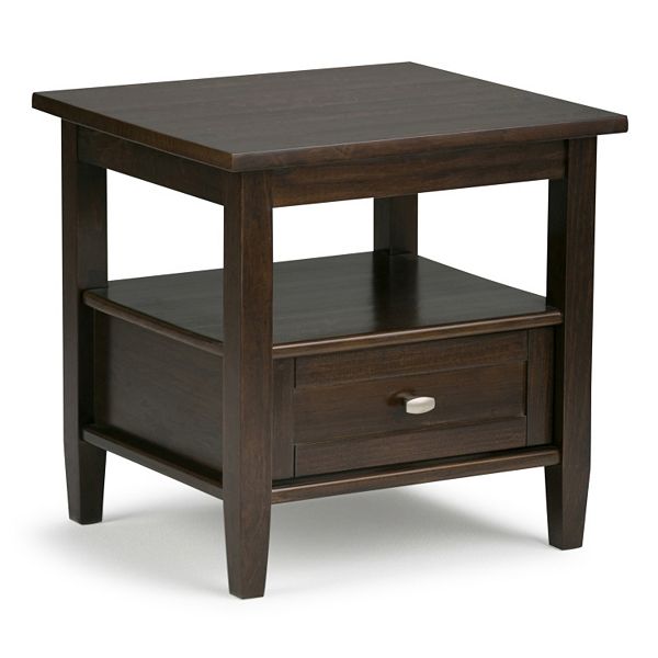 Simpli home hailey solid aged elm wood and metal square modern industrial end side table in distressed java brown wood inlay. Simpli home artisan tv media stand for tvs up to 60, medium auburn brown. The amherst end table was designed to blend effortlessly into any setting in your home. The design is really simple, but very nice and it's an easy build utilizing a nail gun and a drill.
